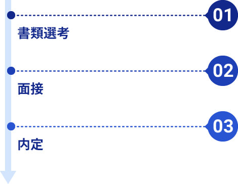 STEP 01 書類選考 職務経歴を重視します。 STEP 02 面接 社長が面接します。人物重視の面接ですので忌憚のない意見をお聞かせください。 STEP 03 内定 おめでとうございます。 |